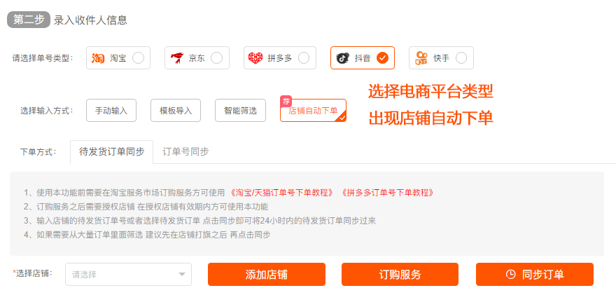 (选择平台后显示店铺自动下单,表示支持一键发货)